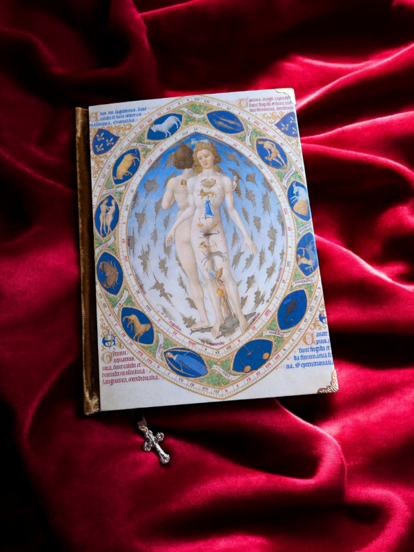 Las Ricas Horas del Duque de Berry (siglo XV) es uno de los manuscritos iluminados más célebres del gótico internacional. Fue realizado por los hermanos Limbourg —Paul, Jean y Herman—, maestros de la miniatura al servicio del duque Jean de Berry, y completado posteriormente por otros artistas. Sus páginas combinan figuras humanas de gran refinamiento, colores intensos y una exquisita decoración dorada. La imagen presenta una escena de carácter simbólico y cosmológico, donde el cuerpo humano se integra al orden del universo, rodeado por los signos del zodíaco y el paso del tiempo. La obra refleja la profunda relación medieval entre arte, fe y conocimiento, transformando cada página en un objeto de contemplación y maravilla.