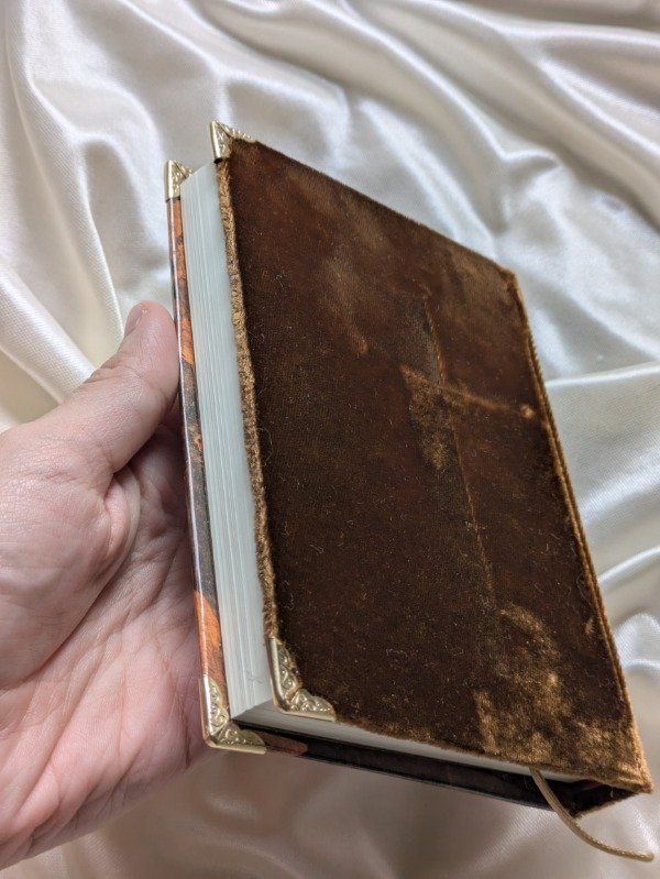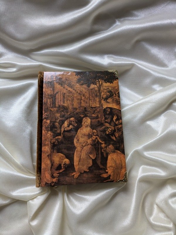 Cuaderno de 100 hojas cosido a mano, forrado en terciopelo marrón con esquineros dorados. La imagen de la portada muestra; La Adoración de los Reyes Magos, una pintura iniciada por Leonardo da Vinci alrededor de 1481 para el monasterio de San Donato a Scopeto.