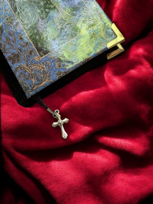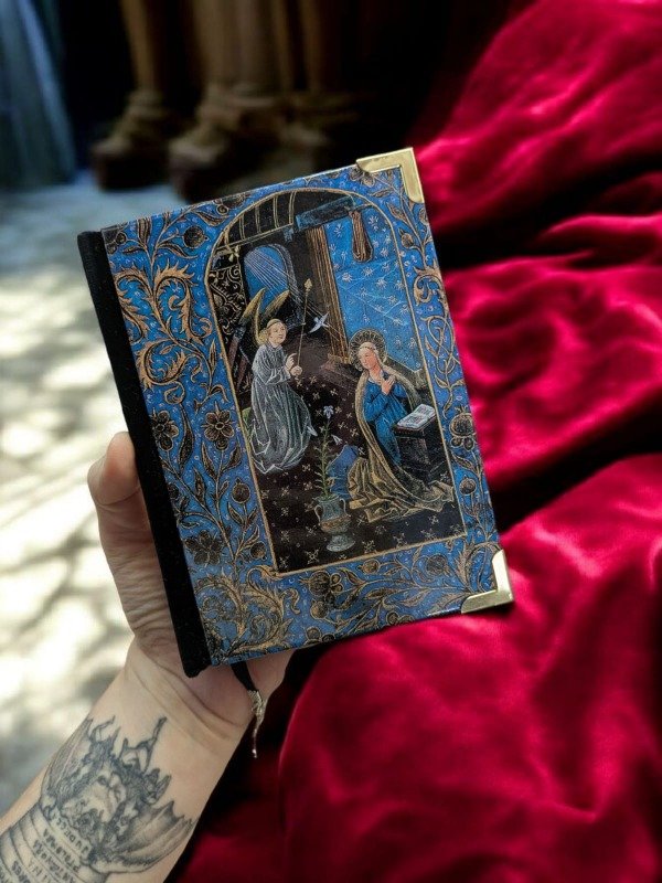 Cuaderno hecho a mano, forrado en terciopelo negro y con esquineros dorados tamaño A6. Tiene como portada una hoja iluminada del Libro de Horas Negro de Brujas.