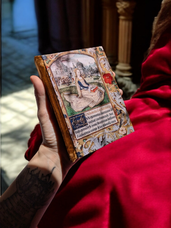 Cuaderno hecho a mano, forrado en terciopelo marrón con esquineros dorados y como portada la imagen de un manuscrito iluminado antiguo desconocido.