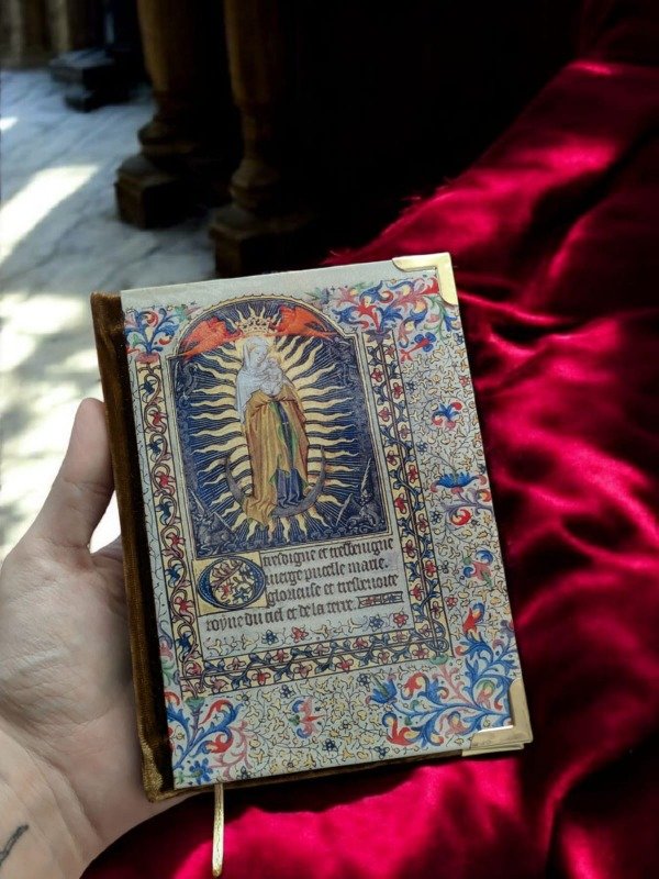 Cuaderno hecho a mano, forrado en terciopelo marrón y esquineros plateados. La portada presenta la reproducción de una página iluminada perteneciente a un manuscrito medieval de procedencia desconocida.