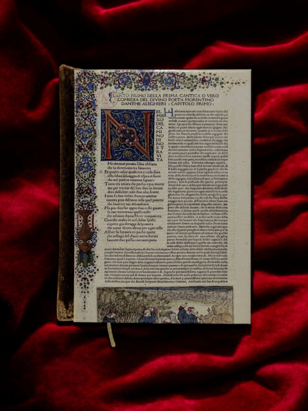 La imagen de la portada es una página iluminada del comentario de Cristoforo (Cristofano) Landino a la Divina Comedia de Dante Alighieri, uno de los manuscritos o incunables más significativos del Renacimiento italiano. Esta edición en particular fue impresa en Florencia en 1481, aunque también circularon versiones manuscritas ricamente iluminadas antes y después. Miniatura inferior que representa una escena del canto I del Infierno, cuando Dante se pierde en la “selva oscura”. Fue una de las primeras veces que se imprimió la Commedia con comentarios eruditos extensos, ayudando a consolidar a Dante como una figura central de la literatura italiana.