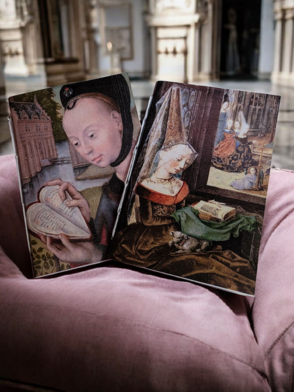A la derecha; Libreta que reproduce una delicada miniatura del Libro de horas de María de Borgoña, donde la Virgen con el Niño y María borgoña aparecen en un entorno lleno de símbolos.