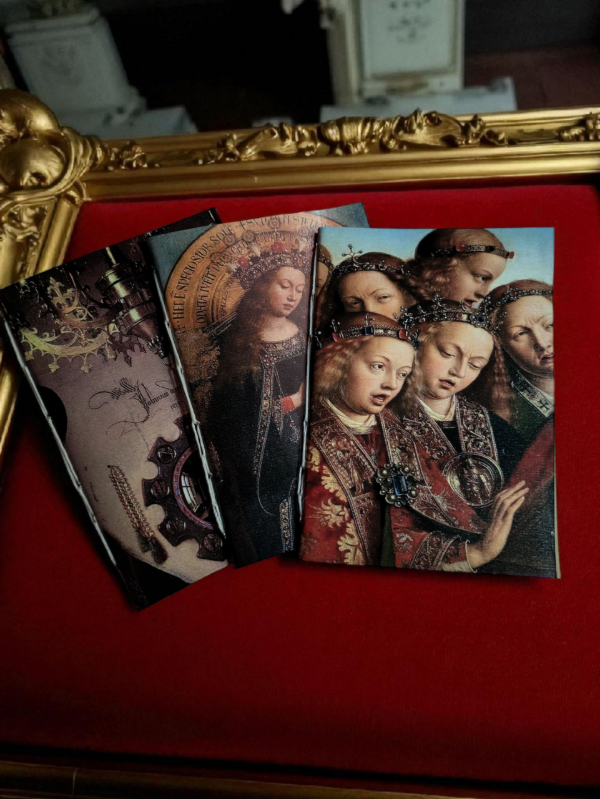 - Dos de las libretas son recortes del retablo de Gante, una muestra los ángeles cantores y Otra, la figura central de la Virgen.